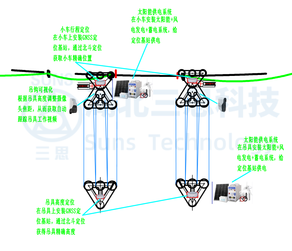 吊鉤可視化系統(tǒng)通過在小車上安裝向下照射的高清攝像頭照射吊具,攝像頭通過安裝在小車上的太陽能+風(fēng)電供電系統(tǒng)持續(xù)提供電能,可實(shí)現(xiàn)24小時(shí)不間斷監(jiān)控,夜間也可實(shí)現(xiàn)對吊具的監(jiān)控。