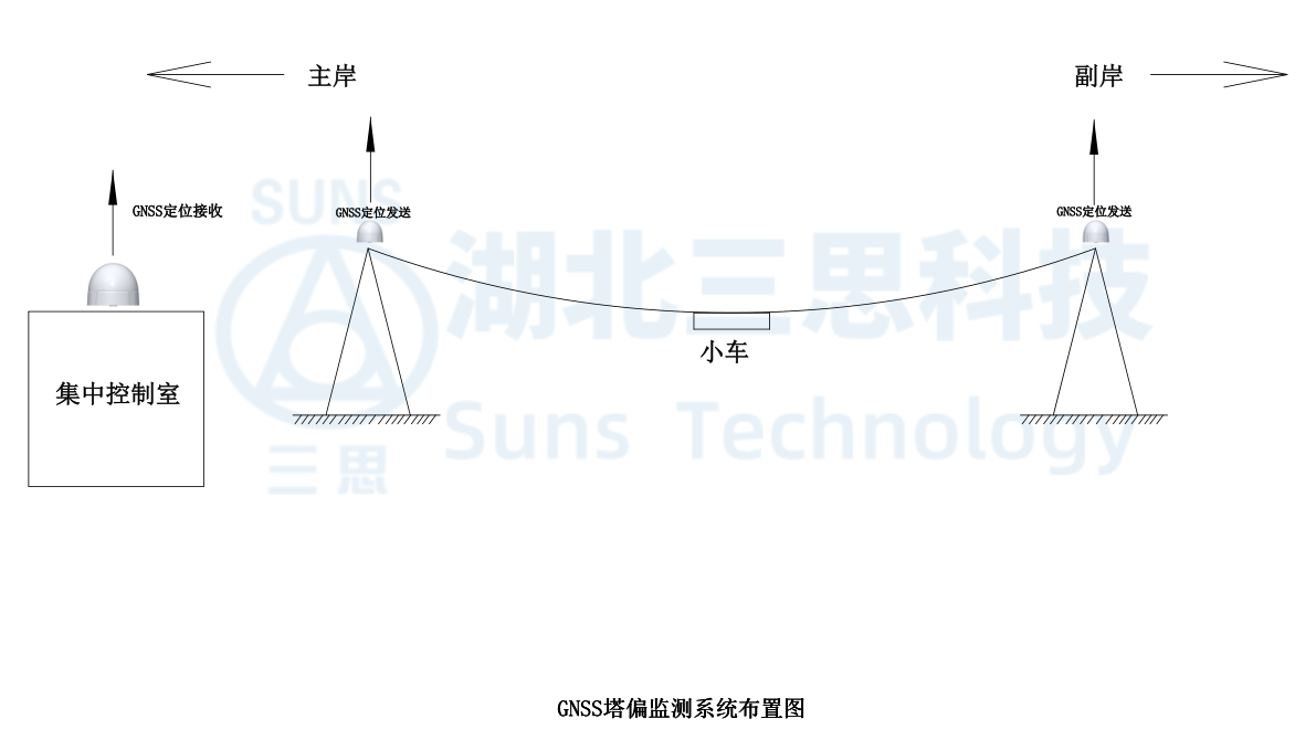 通過在塔頂安裝GNSS北斗定位基站來實(shí)現(xiàn)塔身偏移監(jiān)測;通過安裝在集中控制室的定位主站接收到塔頂傳來的信號給PLC采集器,PLC系統(tǒng)計(jì)算出塔身偏移的位移數(shù)據(jù)并顯示在集中監(jiān)控系統(tǒng)上。