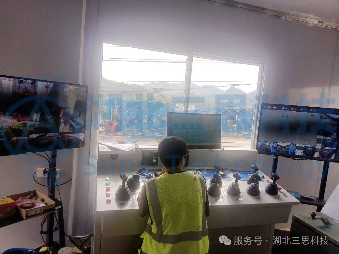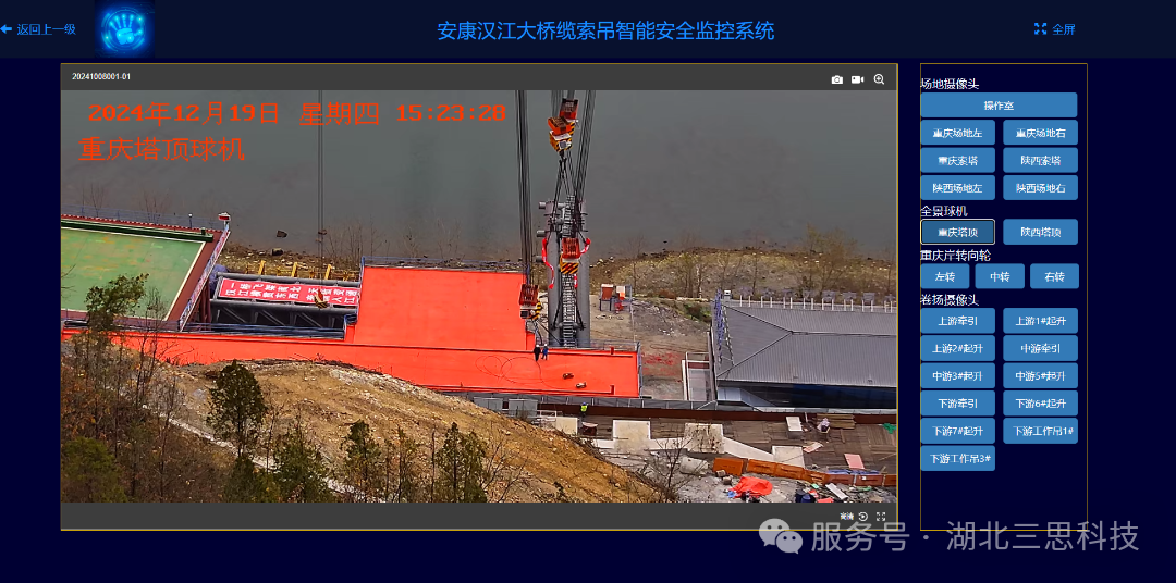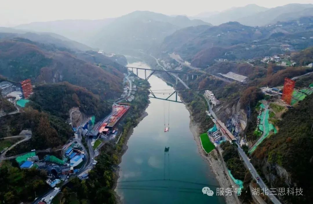 磨刀溪特大橋位于重慶市云陽縣,是重慶市高速公路開州至云陽高速(江口-云陽-龍缸段)區(qū)縣互聯(lián)互通的關鍵控制性工程,主橋為主跨360米的上承式鋼管混凝土拱橋。上部結構采用預應力混凝土先簡支后連續(xù)T梁,主跨為鋼管拱;下部結構為樁基礎+擴大基礎,交界墩為空心薄壁墩,道路設計為雙向4車道,時速80km/h。該橋江口、龍缸兩岸拱座均背靠在陡峭的山體,垂直于磨刀溪河施工現(xiàn)場,有滑坡危巖、巖石裂隙發(fā)育,現(xiàn)場施工場地狹小、危險系數(shù)高、施工難度大。因此,本項目纜索吊機采用了由湖北三思科技自主研發(fā)的纜索吊機集中控制管理系統(tǒng),使設備的操作方式由傳統(tǒng)的“一人控制一機”升級為“一人控制多機”,同時設備在運行過程中既可多機聯(lián)動,亦可單機獨動,為智能化安全管理提供有效保障。