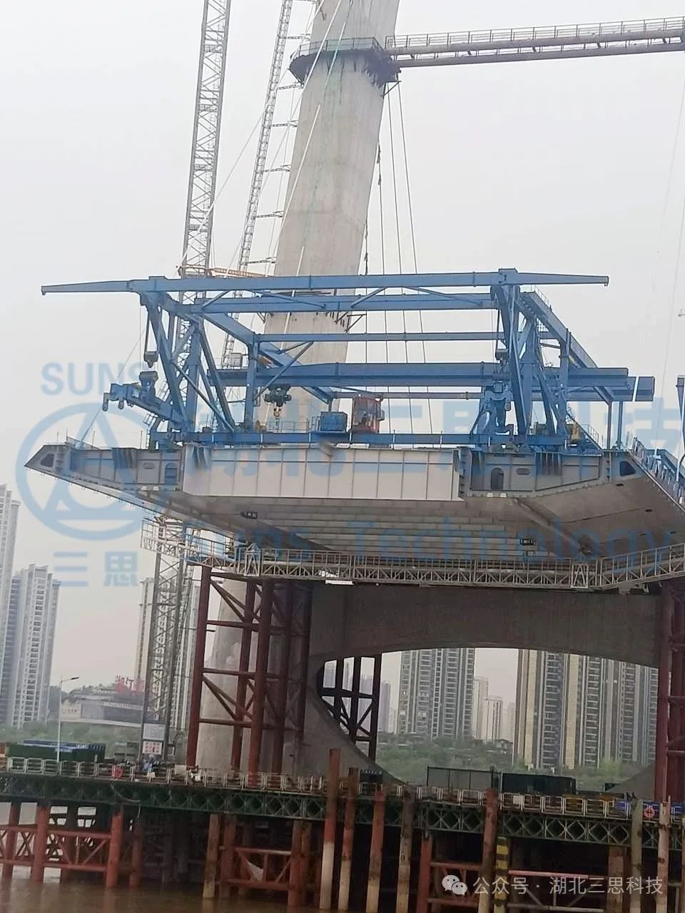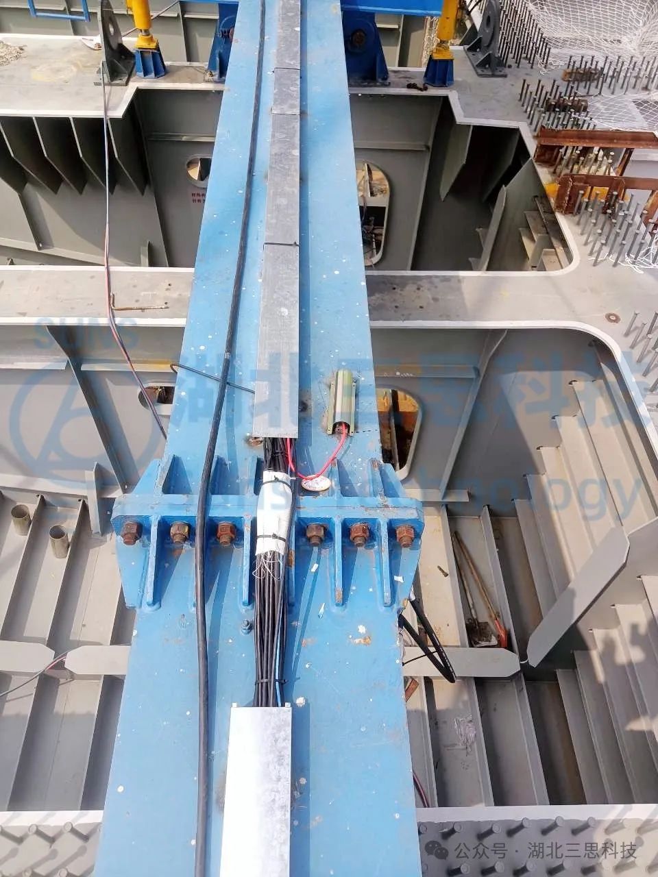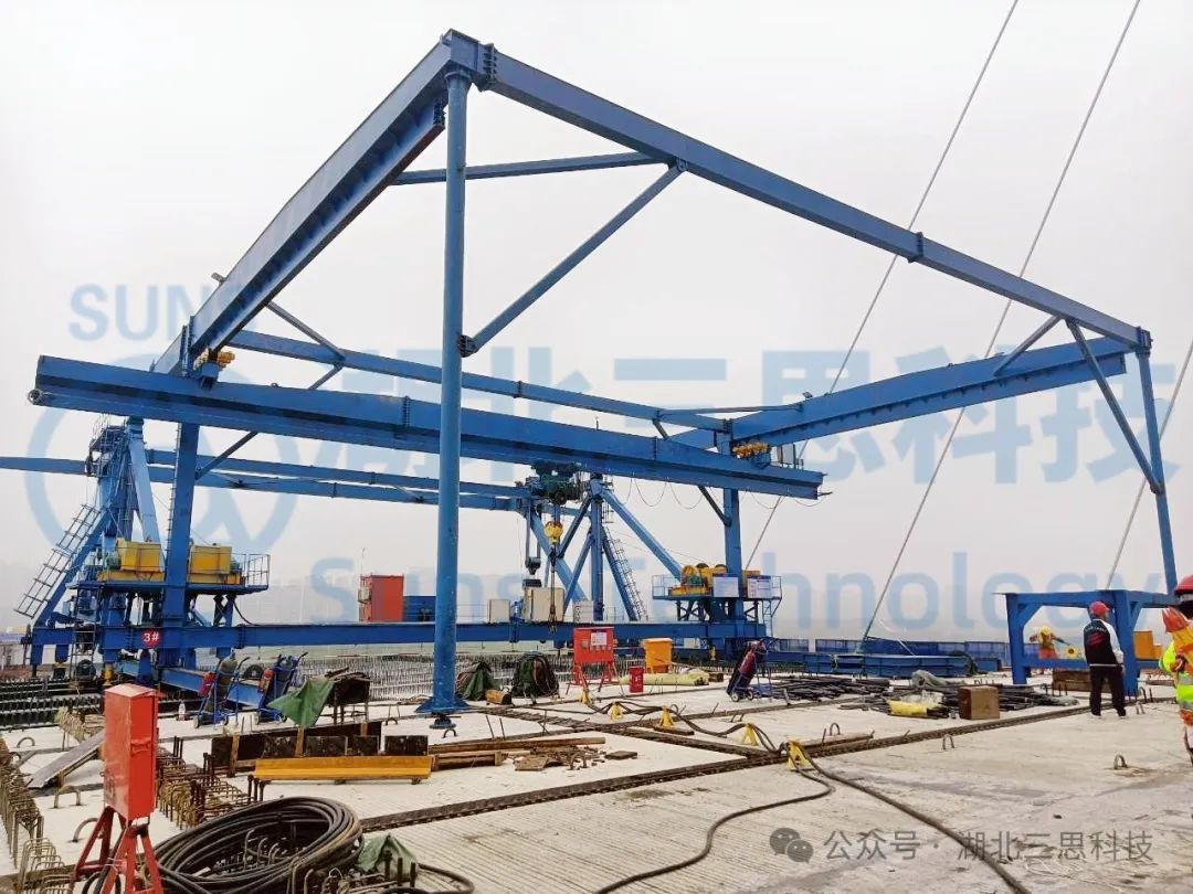 湖北三思科技此次參與的是一臺起重能力達900T的運架一體機,設(shè)備位于湖南某橋梁建設(shè)現(xiàn)場。